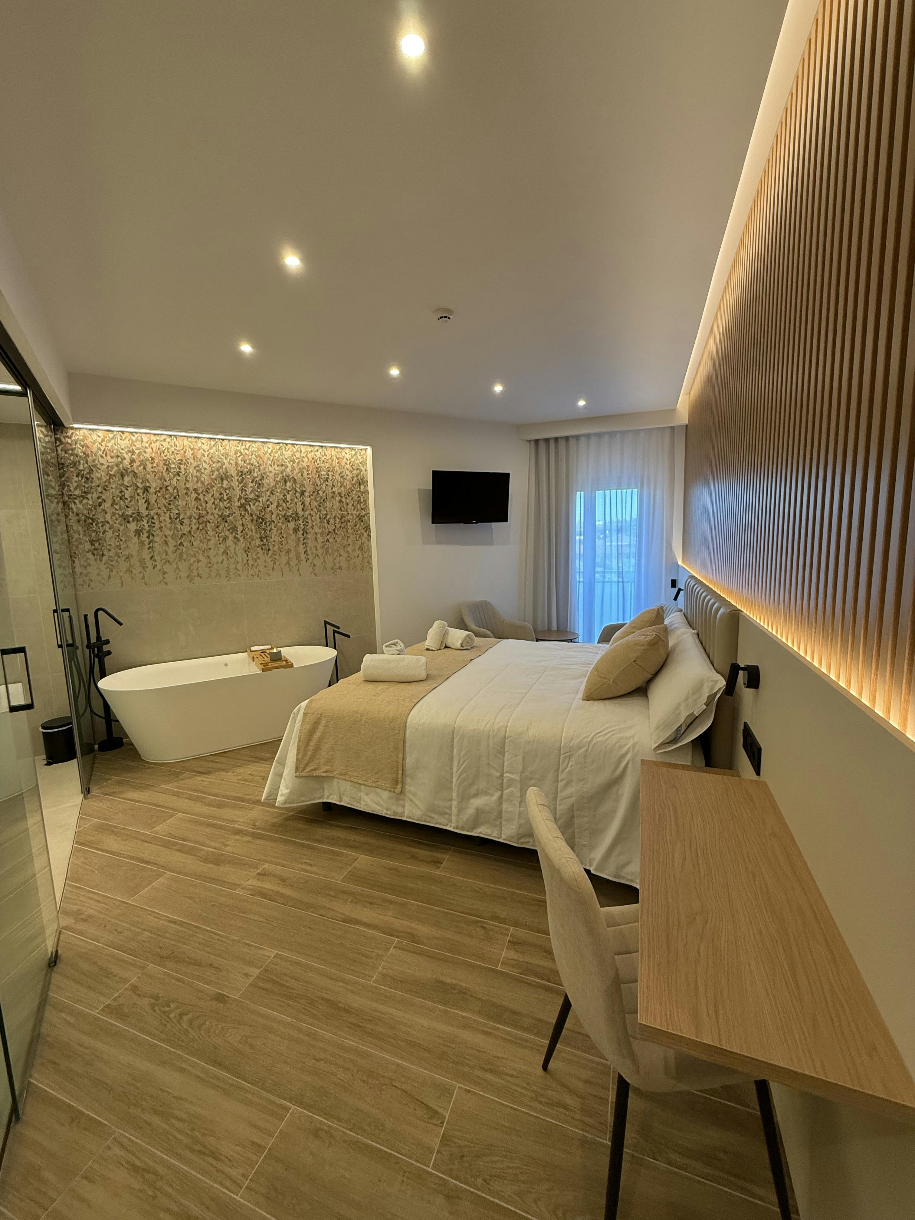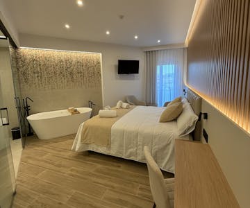 Deluxe room with hydromassage bathtub, King Size Bed, shower and balcony. This double room features air conditioning, welcome products, private bathroom and flat-screen TV.